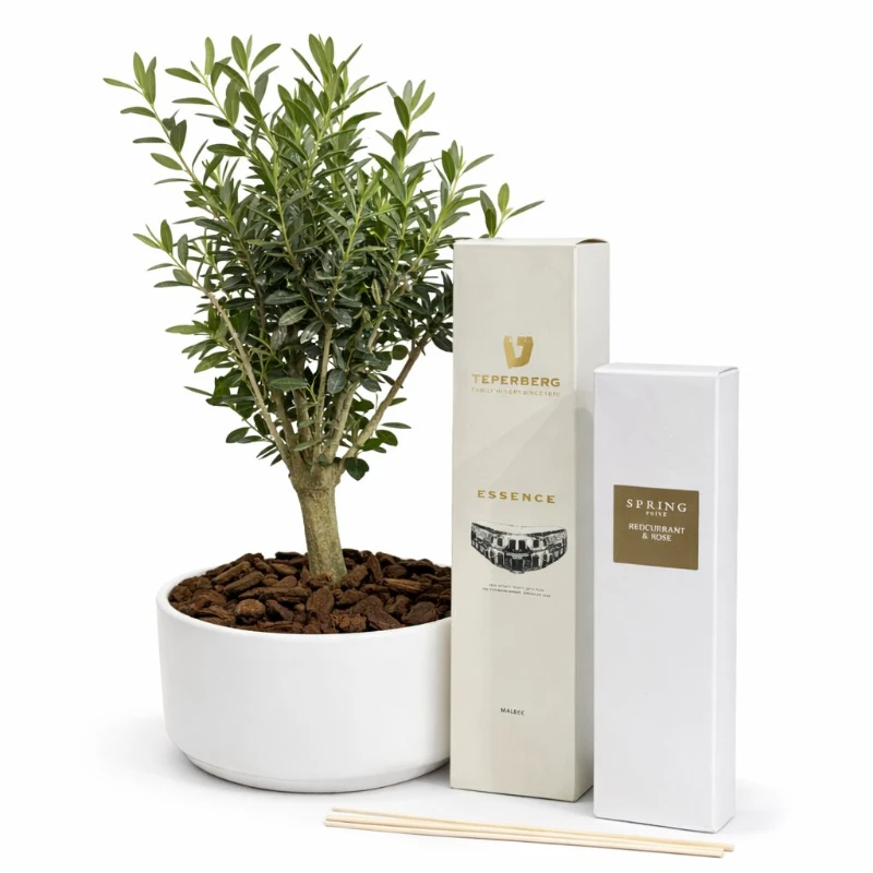 מארז יוקרתי המשלב יין איכותי מבית טפרברג, מבשם לבית מסדרת “ספרינג” בניחוח רענן ועציץ בונסאי מרשים בכלי קרמיקה מעוצב.