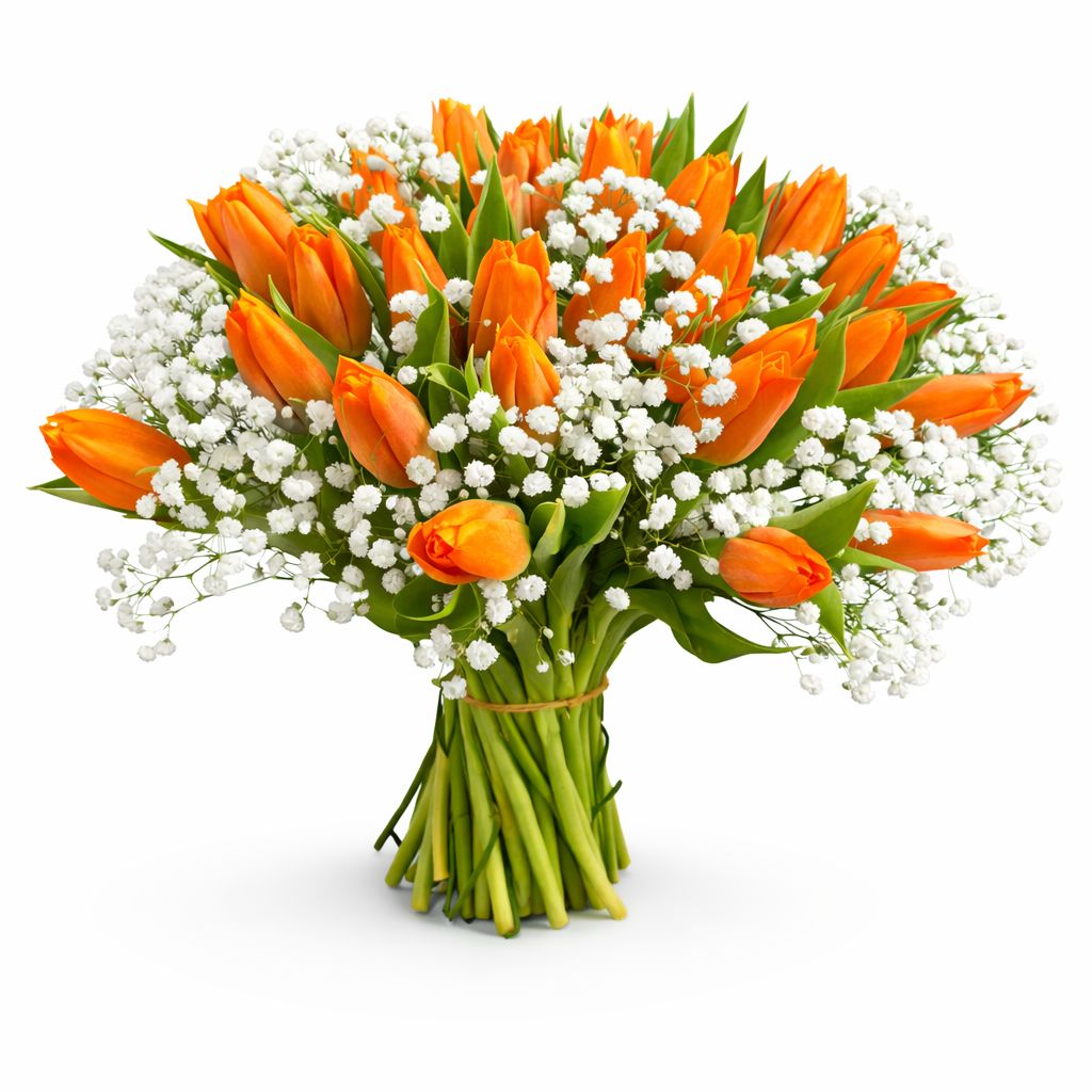 זר טוליפים כתומים עוצמתי בשילוב גיבסנית עדינה.