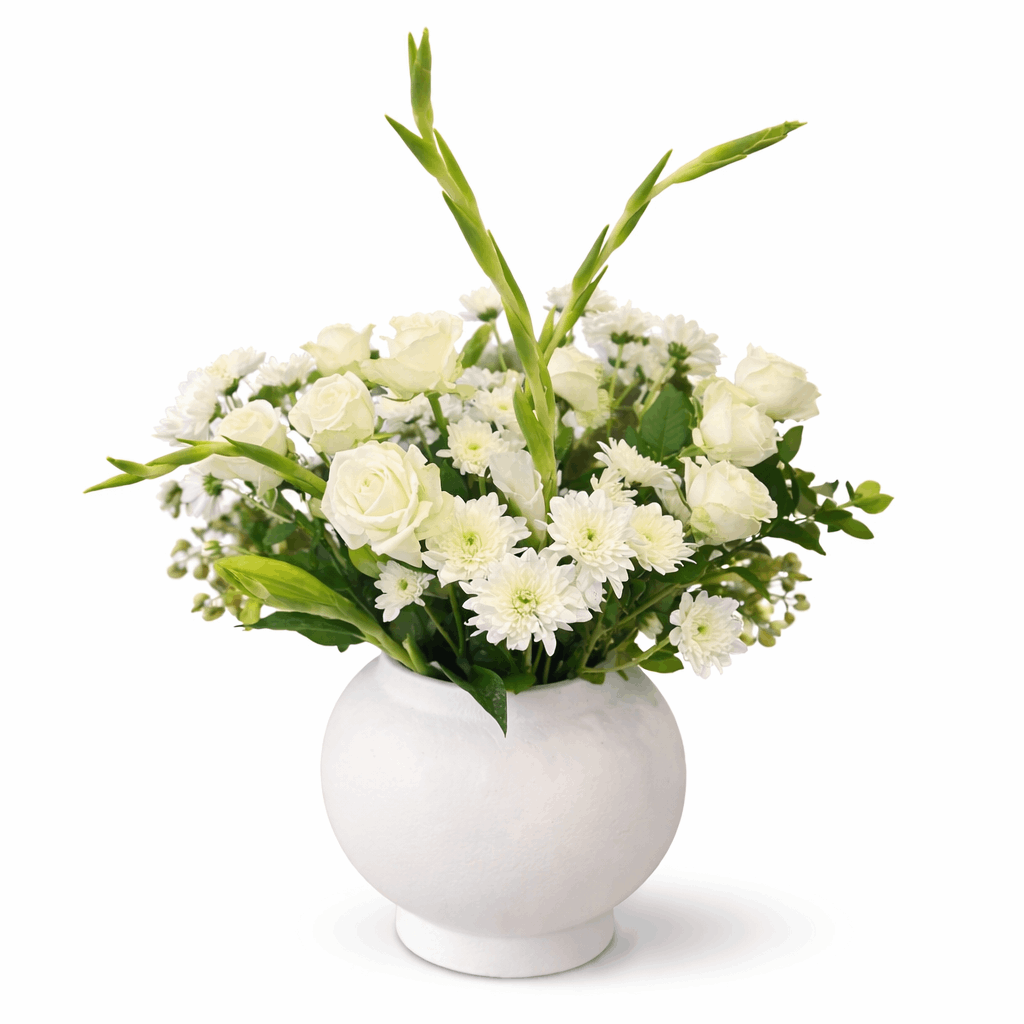 אגרטל בטון מוחלק לבן בשילוב של פרחים חגיגיים
