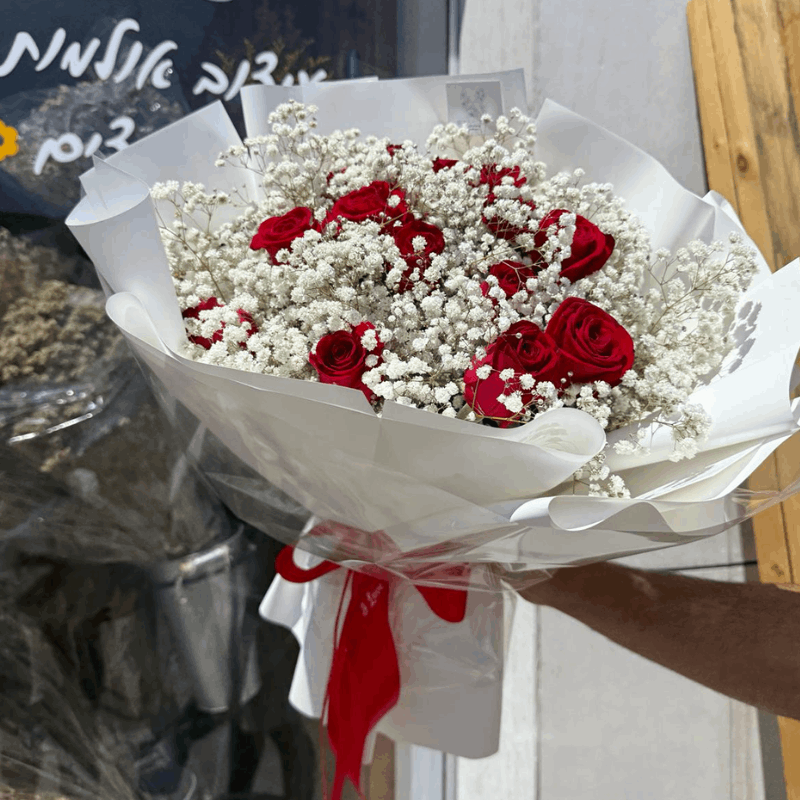 זר ורדים מרהיב בגווני אדום ולבן, משולב עם גיבסניות עדינות.