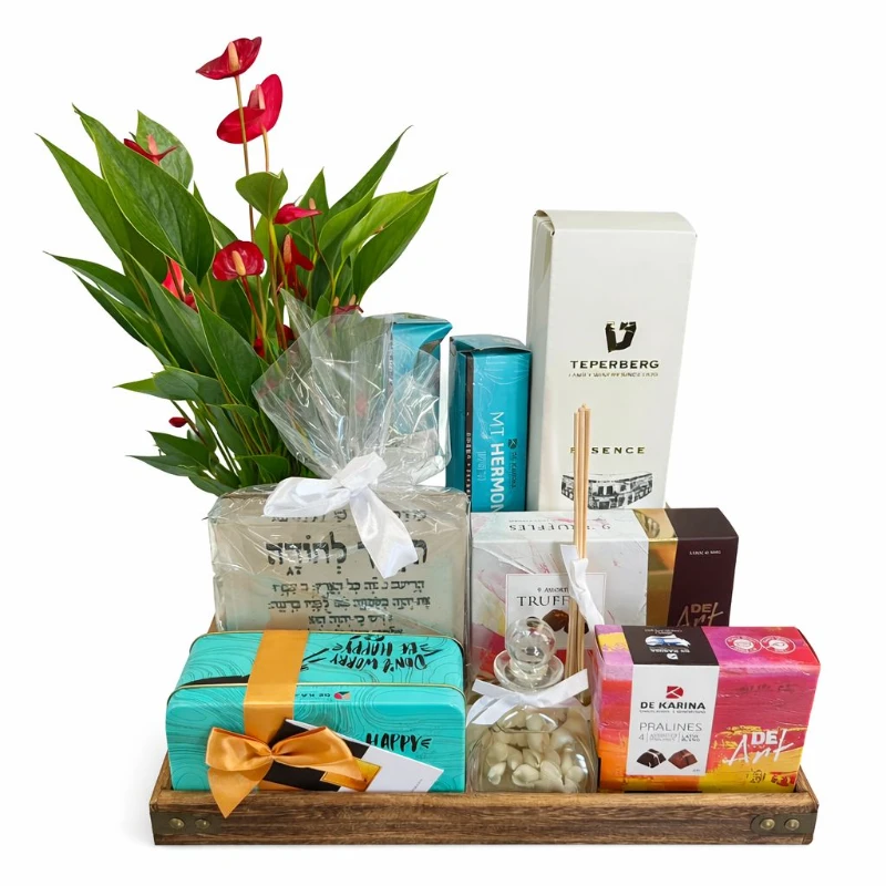מארז יוקרה עם דגמי שוקולד דה קרינה המובחרים והיוקרתיים , עם מזמור לתודה מצורף דגם זכוכית יין משובח לבחירה ועציץ אנטוריום יוקרתי .