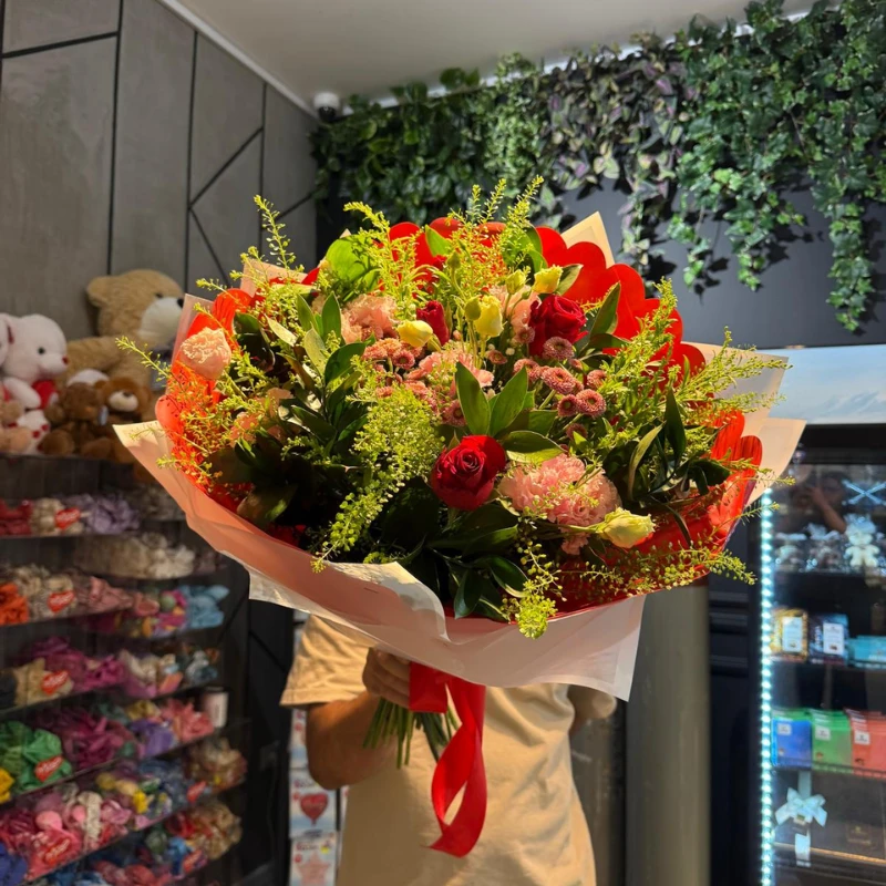 זר ורדים עדינים בשילוב גיפסנית לבנה וירק עונתי שופע. בעיצוב קלאסי ורומנטי, הזר מושלם ליום הולדת, יום נישואין, לידה, או כהבעת אהבה והערכה. השילוב של ורדים, גיפסניות וירק עונתי יוצר מראה מלא הרמוניה ויוקרה עדינה.
