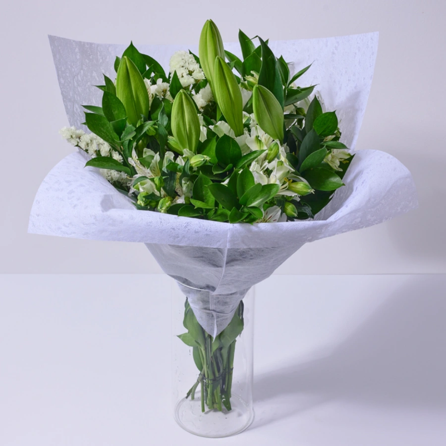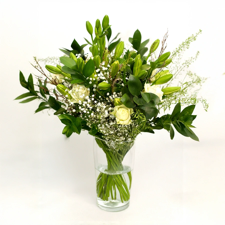 לבן טהור – זר ורדים, ליזיאנטוס, גיפסנית וירק
